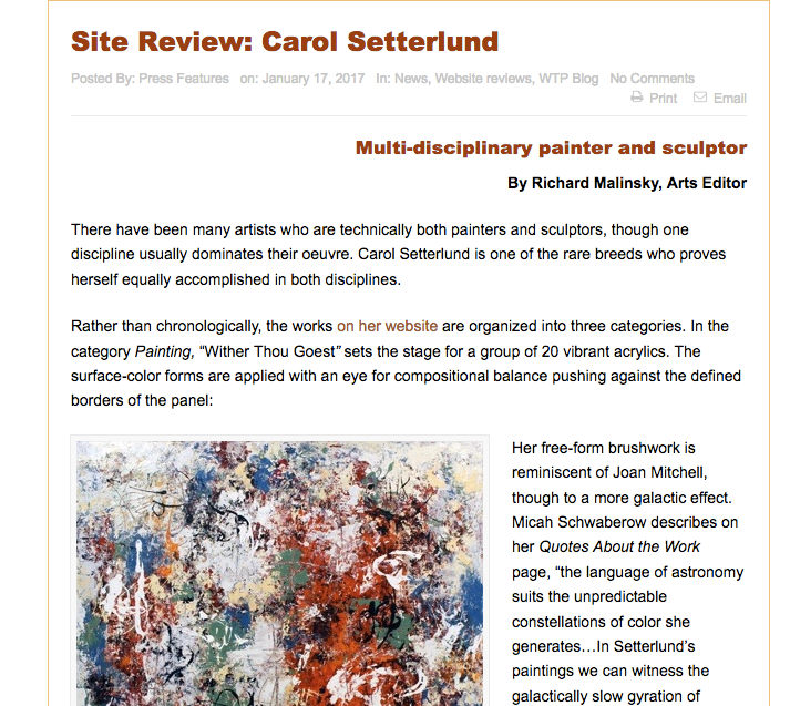 The Woven Tale Review just released a wonderful article about Carol Setterlund's paintings and sculptures. As the artists reception for her approaches on February 4th, we love seeing praises for one of our great long standing artists.